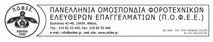 Τέλος, σε περίπτωση κατάθεσης νέου νομοσχεδίου, όπως συζητείται, η Π.Ο.Φ.Ε.Ε. θα υποβάλει άμεσα ορισμένες αναγκαίες τεχνικές ρυθμίσεις για βελτίωση ισχυουσών νομοθετικών διατάξεων που κρίνονται απαραίτητες για την εύρυθμη βεβαίωση και εισπραξιμότητα των Δημοσίων Εσόδων.
